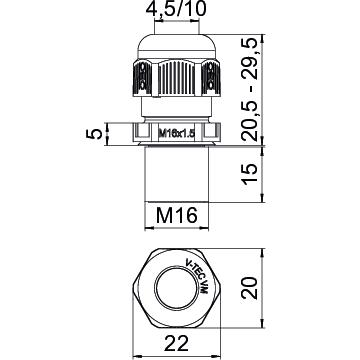 Barva črna Brez halogenov da Deljiv vijačni spoj ne Dimenzija M16 Dolžina navoja 15 mm Izvedba ravno Maks. temperaturno območje uporabe 65 °C Material poliamid Mera e 22 mm Mera L maks. 29,5 mm Mera L min. 20,5 mm Mera L1 15 mm Mera L2 5 mm Min. temperaturno območje uporabe -20 °C Možnosti natezne razbremenitve da Navoj M16 x 1,5 Navojni priključek ploščatega kabla ne Nazivna velikost navoja 16 Nestabilen navor 2,5 Nm Odtis CO2 (GWP) od zibelke do vrat 0,0391 kg CO2e / 1 Kos ognjeodporen po standardu VDE 0471/DIN 695 del 2-1, kontrolna temperatura 650 °C Ojačan s steklenimi vlakni ne S protimatico ne Šestkotnik – kotna mera 22 mm Strmina navoja 1,5 mm Tesnilno območje D maks. 10 mm Tesnilno območje D min. 4,5 mm Tip navoja metrično Udarna trdnost ne Večkratni tesnilni vložek ne Velikost ključa 20 Vrsta tesnila Tesnilni obroč Vrsta zaščite IP68 za Ex-cono brez za plin za Ex-cono brez za prah za Ex-cono brez Zaščita pred upogibanjem ne Zaščiten pred eksplozijo ne - Vsi tipi