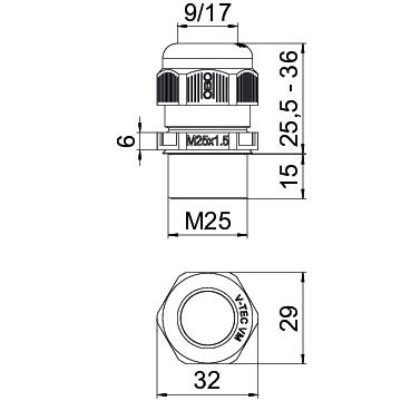 Barva črna Brez halogenov da Deljiv vijačni spoj ne Dimenzija M25 Dolžina navoja 15 mm Izvedba ravno Maks. temperaturno območje uporabe 65 °C Material poliamid Mera e 32 mm Mera L maks. 36 mm Mera L min. 25,5 mm Mera L1 15 mm Mera L2 6 mm Min. temperaturno območje uporabe -20 °C Možnosti natezne razbremenitve da Navoj M25 x 1,5 Navojni priključek ploščatega kabla ne Nazivna velikost navoja 25 Nestabilen navor 5 Nm Odtis CO2 (GWP) od zibelke do vrat 0,0727 kg CO2e / 1 Kos ognjeodporen po standardu VDE 0471/DIN 695 del 2-1, kontrolna temperatura 650 °C Ojačan s steklenimi vlakni ne S protimatico ne Šestkotnik – kotna mera 32 mm Strmina navoja 1,5 mm Tesnilno območje D maks. 17 mm Tesnilno območje D min. 9 mm Tip navoja metrično Udarna trdnost ne Večkratni tesnilni vložek ne Velikost ključa 29 Vrsta tesnila Tesnilni obroč Vrsta zaščite IP68 za Ex-cono brez za plin za Ex-cono brez za prah za Ex-cono brez Zaščita pred upogibanjem ne Zaščiten pred eksplozijo ne - Vsi tipi