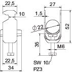 Opis izdelkaClamp clip with hammerhead foot, plastic pressure sleeve made of polypropylene. For vertical and horizontal mounting of 1 single cable on a C-profile rail. For a slot width 16–17 mm. With 1-start screw thread on pressure sleeve, universal hexagonal screw head WAF10, with slot and cross recess. Suitable for assembly indoors and outdoors. We recommend the use of a counter-sleeve.