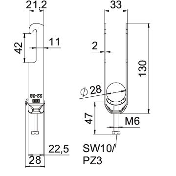 Brez halogenov da Debelina pločevine 2 mm Dimenzija 22-28mm Dodatna površina vroče pocinkano Dodatni material Jeklo Dolžina 22,5 mm Maks. vpenjalno območje D 28 mm Maks. Zatezni moment 3 Nm Material Jeklo Mera A 22,5 mm Mera B 33 mm Mera C 28 mm Mera G (mm) M6 Mera H 130 mm Mera L 46 mm Mera t 2 mm Min. vpenjalno območje D 22 mm Način montaže Kotni profil Navoj M6 Odtis CO2 (GWP) od zibelke do vrat 0,311 kg CO2e / 1 Kos Površina vroče pocinkano S kovinsko objemno spono da Širina 33 mm Širina utora 10 mm Število kablov/cevi 2 Višina 130 mm za premer cevi maks. 28 mm za premer cevi min. 22 mm Zunanja dolžina 28 mm - Vsi tipi