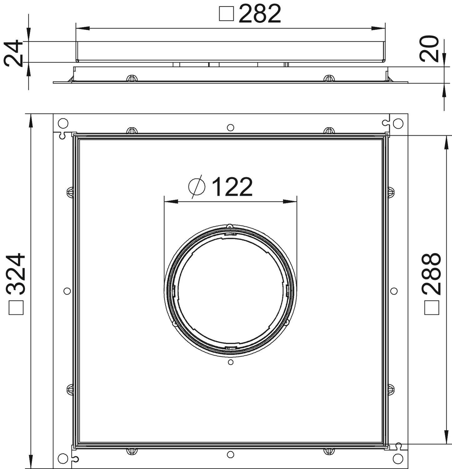Debelina talne obloge 18 mm Dimenzija 283x283x20 Izvedba kabelskega odvoda Potopni tubus Material Nerjaveče jeklo 1.4301 Mera A 324 mm Mera B 288 mm Mera C 282 mm Mera H 20 mm Nega tal mokro Nosilec naprav za sprejem priključnih doz ne Odtis CO2 (GWP) od zibelke do vrat 19,3264 kg CO2e / 1 Kos Število izvodnic napeljav 1 - Vsi tipi