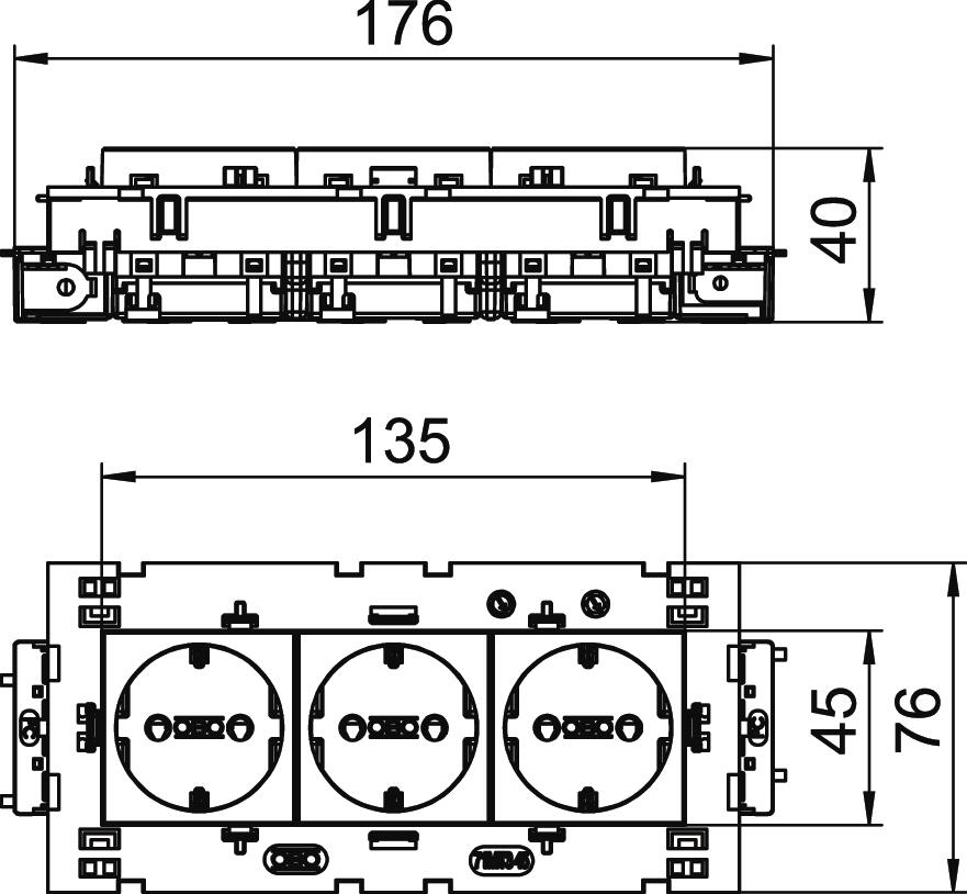 Opis izdelkaProtective contact socket with connection to side, triple 0°, with increased touch protection, with screwless terminals, 2-pin, 16 A, 250 V~, with connection terminals to IEC 60884-1, suitable for the installation in Rapid 80 device installation trunking systems.