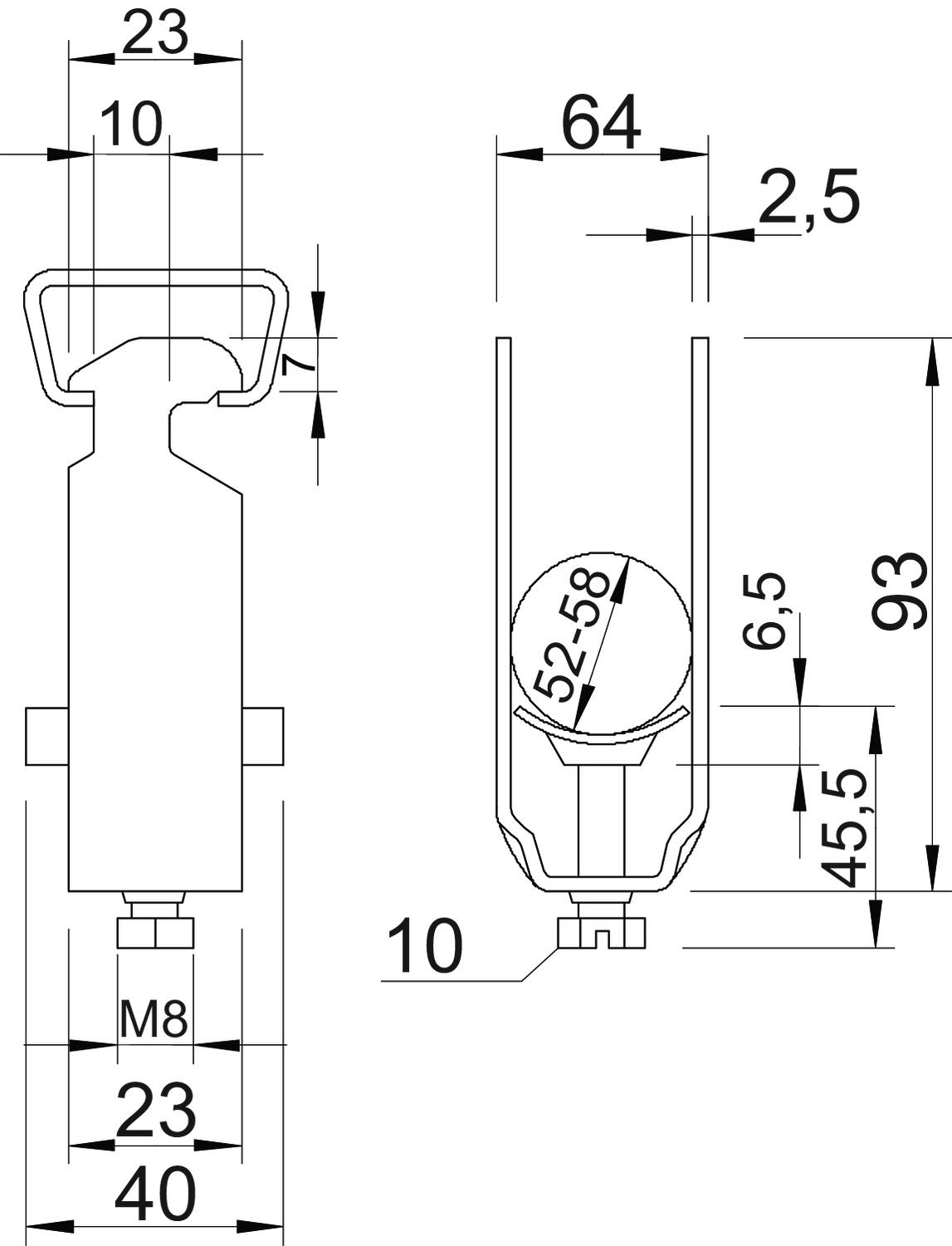 Brez halogenov da Dimenzija 52-58mm Dodatna površina vroče pocinkano Dodatni material Jeklo Kakovost materiala kadi polipropilen Maks. vpenjalno območje D 58 mm Maks. Zatezni moment 5 Nm Material Jeklo Material kadi Plastika Mera A 23 mm Mera B 64 mm Mera C 40 mm Mera G (mm) M8 Mera H 93 mm Mera L 45,5 mm Mera t 2,5 mm Mera x 6,5 mm Min. vpenjalno območje D 52 mm Način montaže Jekleni montažni profil Odtis CO2 (GWP) od zibelke do vrat 0,2532 kg CO₂e / 1 Kos Površina vroče pocinkano S kovinsko objemno spono ne S plastično objemno spono da Število kablov/cevi 1 Udarna trdnost ne Z objemno spono ne za tirnico s širino zareze (z intervalom) maks. 17 mm za tirnico s širino zareze (z intervalom) min. 16 mm - Vsi tipi