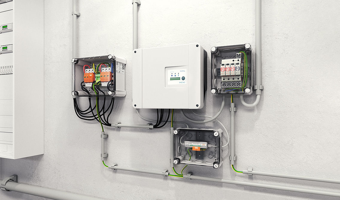 Prenapetostna zaščita za fotovoltaične naprave ima zmeraj dve plati. Iz različnih razlogov se lahko prenapetosti pojavijo v sistemu tako na enosmerni kot na izmenični strani ter tako na primer poškodujejo razsmernik. Prenapetostna zaščita OBO zanesljivo zavaruje vse plati. Za zaščito vhoda na strani razsmernika z enosmernim tokom ponuja OBO portfelj generatorskih priključnih omaric z zaščito pred strelo in prenapetostno zaščito. Te so se izkazale kot posebej zanesljiva rešitev za zaščito fotovoltaičnih naprav in združujejo strokovno znanje OBO iz dveh proizvodnih enot hkrati: priključne omarice s področja povezovalne in pritrdilne tehnologije, odporne proti vremenskim vplivom, in zanesljive rešitve s področja prenapetostne zaščite.