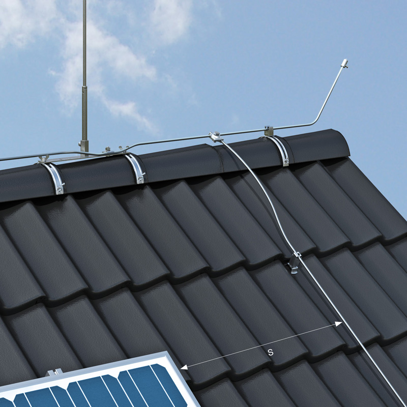 Sortiment za zunanjo zaščito pred strelo OBO pri fotovoltaičnih napravah med drugim obsega: