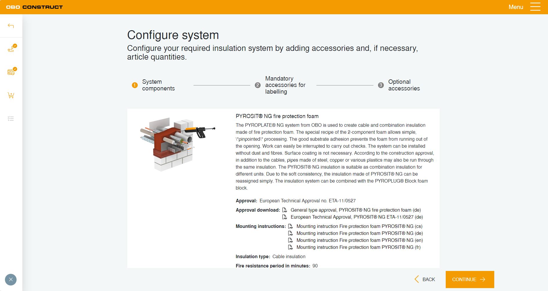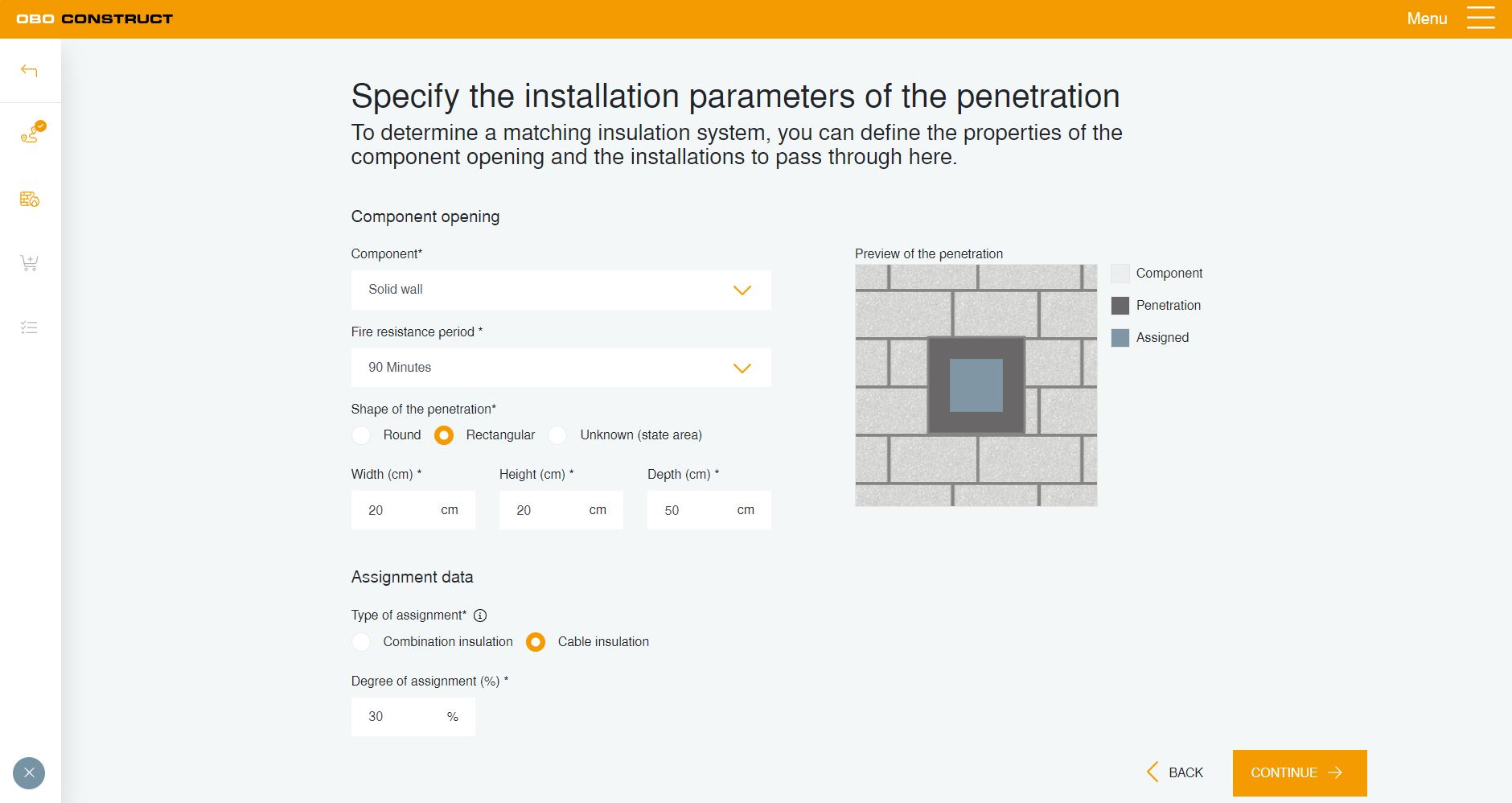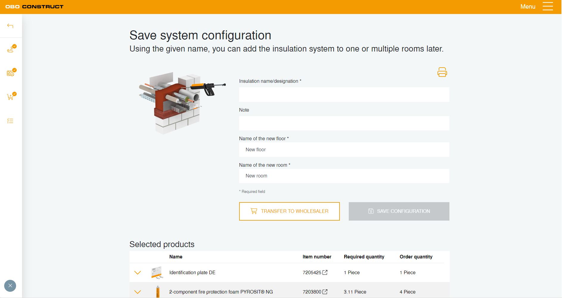 Po vnosu dimenzij in medija, ki ga je treba izvesti za preboj, orodje izračuna potrebno količino, npr. protipožarne pene ali protipožarnih blokov. Kombinacije izdelkov je mogoče tudi izračunati ter preprosto in priročno dodati potrebne dodatke.