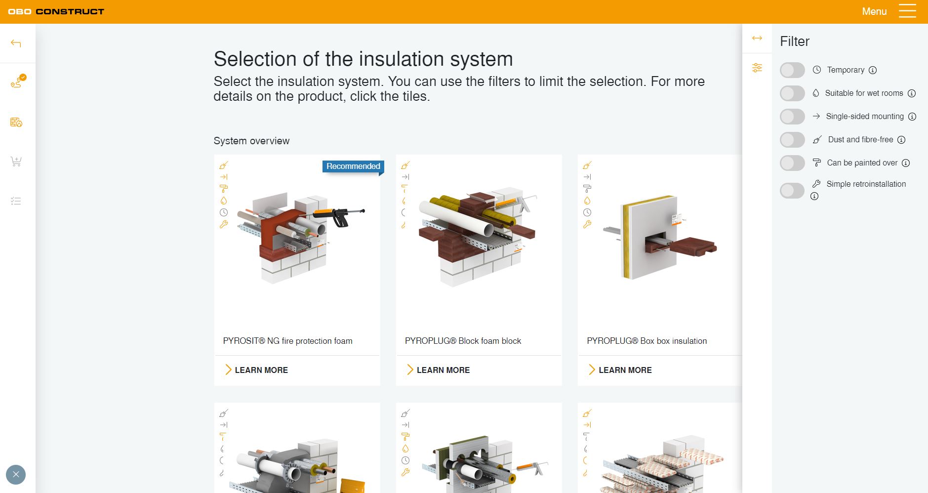 To orodje za načrtovanje vam bo pomagalo pri načrtovanju vaših protipožarnih pregrad v skladu z odobritvijo. Le nekaj vprašanj vas bo korak za korakom pripeljalo do ustreznega sistema protipožarne pregrade. Spletna aplikacija ponuja možnost ustvarjanja, shranjevanja in kasnejšega urejanja projekta s katere koli končne naprave.